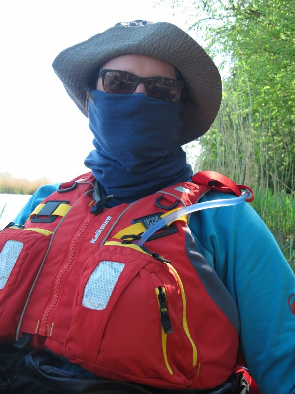 Danach geht es zügig weiter. Der auffrischende Wind bringt uns ca. 7km Gegenwindpaddelei bevor wir wieder in die geschützten Bereiche kommen. Aber immer noch brennt die Sonne vom Himmel herab und wir schützen uns mit allen Mitteln gegen das helle Licht und die Auswirkungen auf der Haut. Sieht martialisch aus, hilft aber…